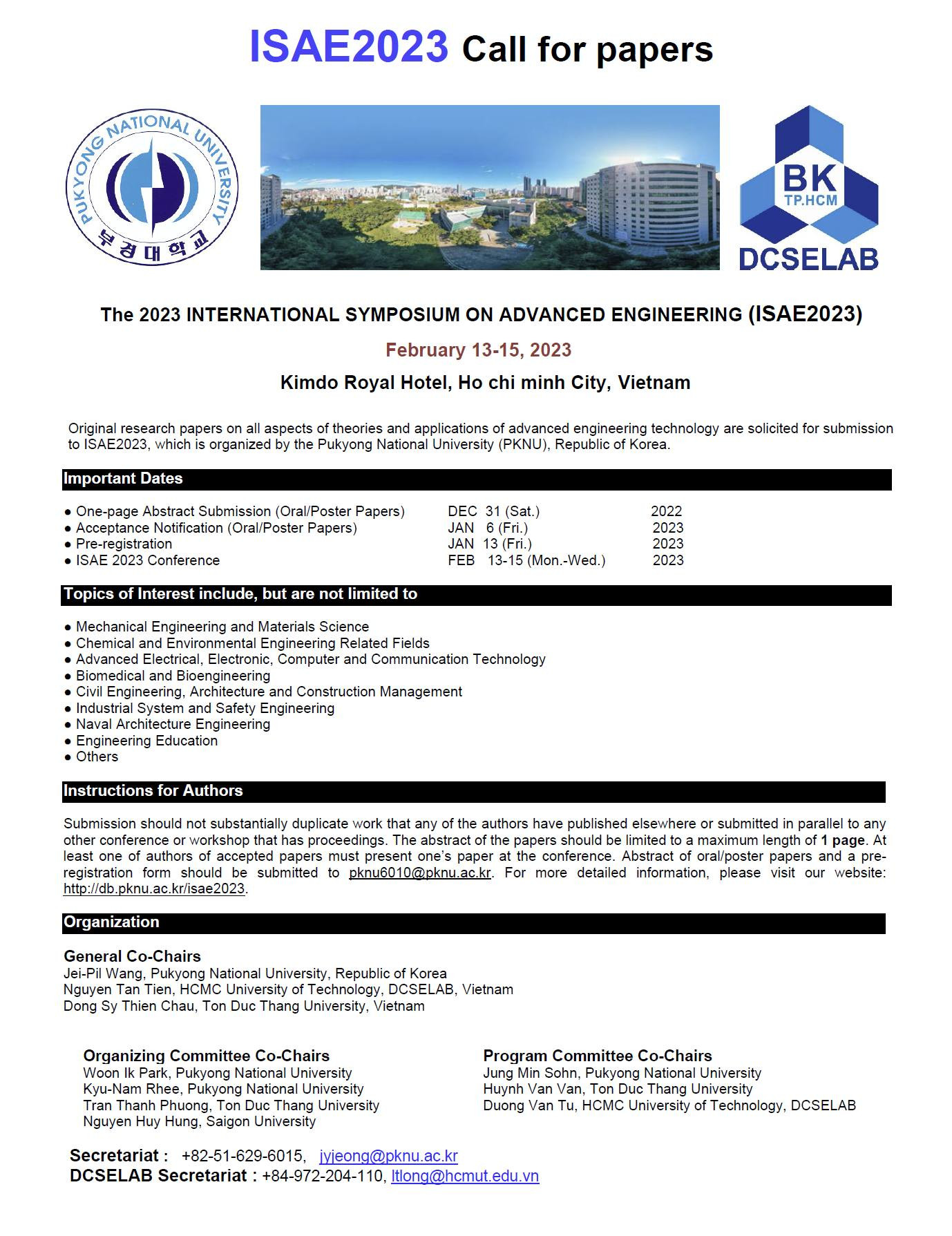 The 2023 International Symposium on Advanced Engineering (ISAE 2023) , Time: February 13-15, 2023, Venue: Kimdo Royal Hotel Ho Chi Minh City Vietnam